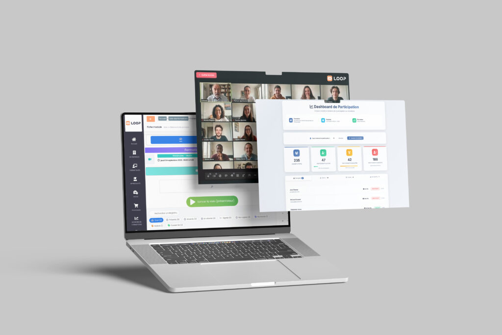 Animez vos classes virtuelles directement depuis Loop Formation, sans outil externe ni abonnement supplémentaire. Notre plateforme de visioconférence intégrée accueille jusqu’à 100 participants simultanés avec une qualité professionnelle, et génère automatiquement les preuves de présence pour vos justificatifs Qualiopi.