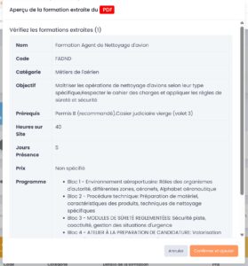 Les données extraites sont proposées pour validation. Vous vérifiez que l’IA a bien compris, corrigez si nécessaire, puis validez l’import. La qualité des données est garantie par cette étape de contrôle.