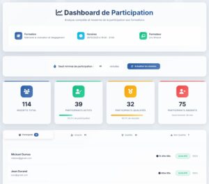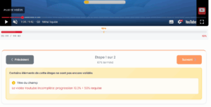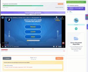 L’interface e-learning est moderne et intuitive. L’apprenant avance à son rythme, valide ses acquis par les quiz, reçoit des feedbacks immédiats. L’engagement est maximisé par l’interactivité.
