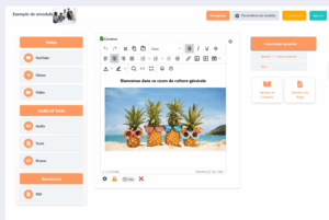 Un module e-learning Loop peut contenir tout type de contenu : vidéos (YouTube, Vimeo, MP4), documents PDF, textes enrichis, fichiers audio, quiz interactifs, zones de dépôt de devoirs. Combinez-les pour créer des expériences d’apprentissage complètes.